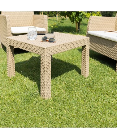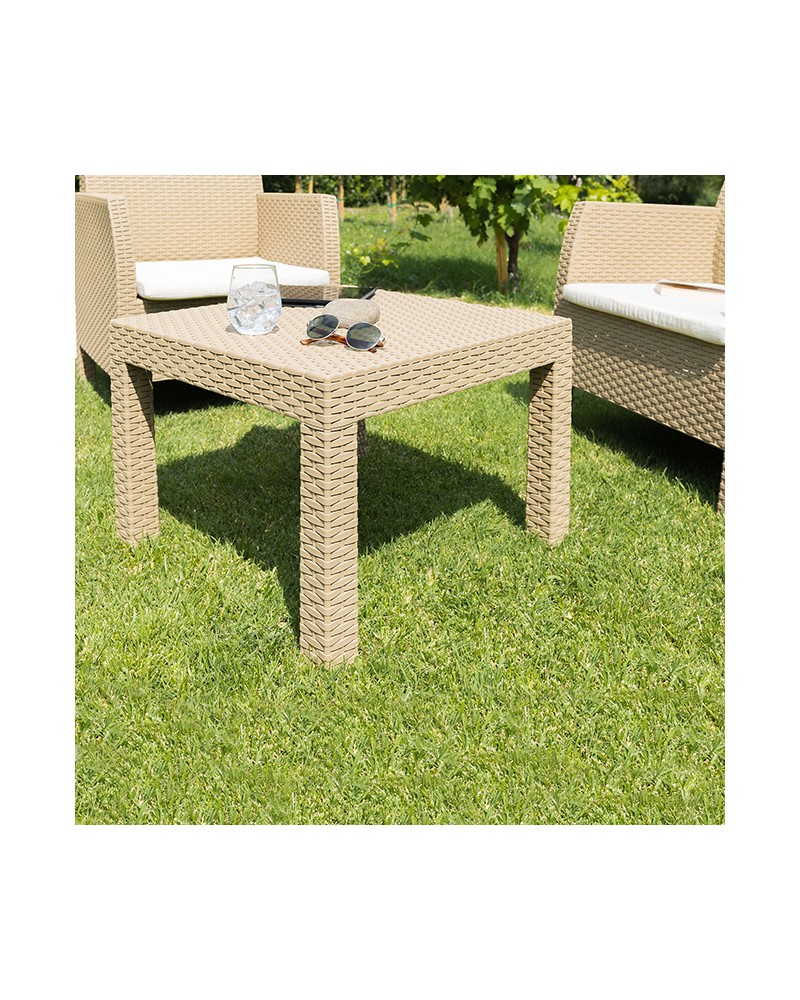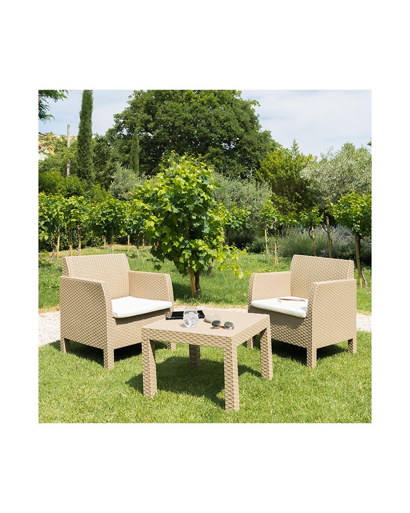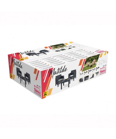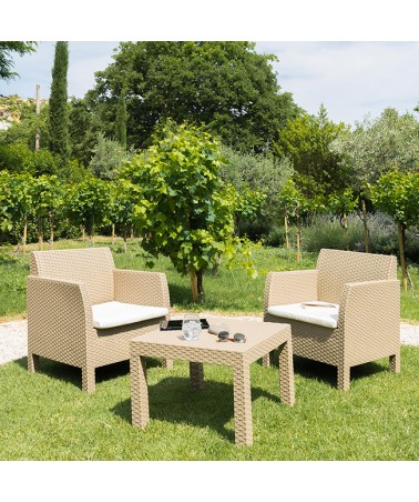 Conjunto de jardim c/ 2 poltronas com almofadas e 1 mesa de jardim. Ideal para jardins ou terraços pequenos.